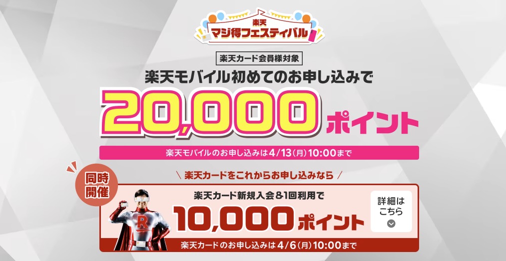 「楽天マジ得フェスティバルって何?20,000ポイントもらえるって本当?」「楽天カードを持っていないとダメ?再契約でも使える?」「他のキャンペーンと併用できるの?結局どれが一番お得なの?」 結論から言うと、楽天マジ得フェスティバルは楽天カード会... -