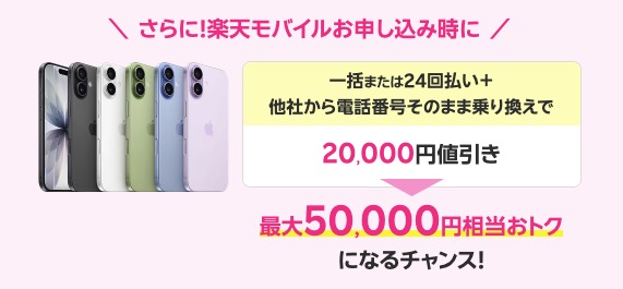 | 楽天モバイル初めて + 楽天カードなし(作ってもOK) | マジ得フェスティバル + カード新規入会 | 50,000円相当 |