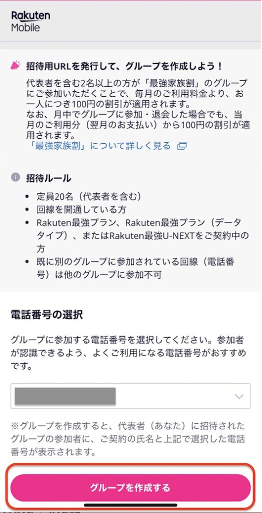 2. 電話番号を確認し画面下部の「グループを作成する」をタップ