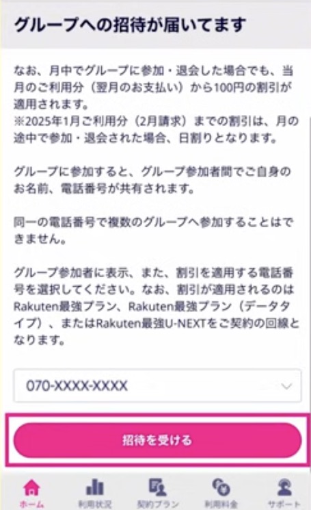招待リンクを共有された側は、URLをクリックし、「招待を受ける」をタップ。画面に「グループに参加しました」と表示されれば成功です。