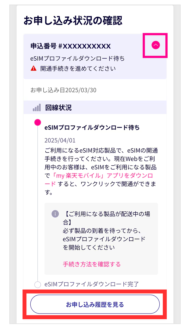my楽天モバイルアプリ → 申し込み履歴 → 開通手続きへ進みます。MNPの場合は先にワンストップ申請(受付9:00〜21:00)を行いましょう。