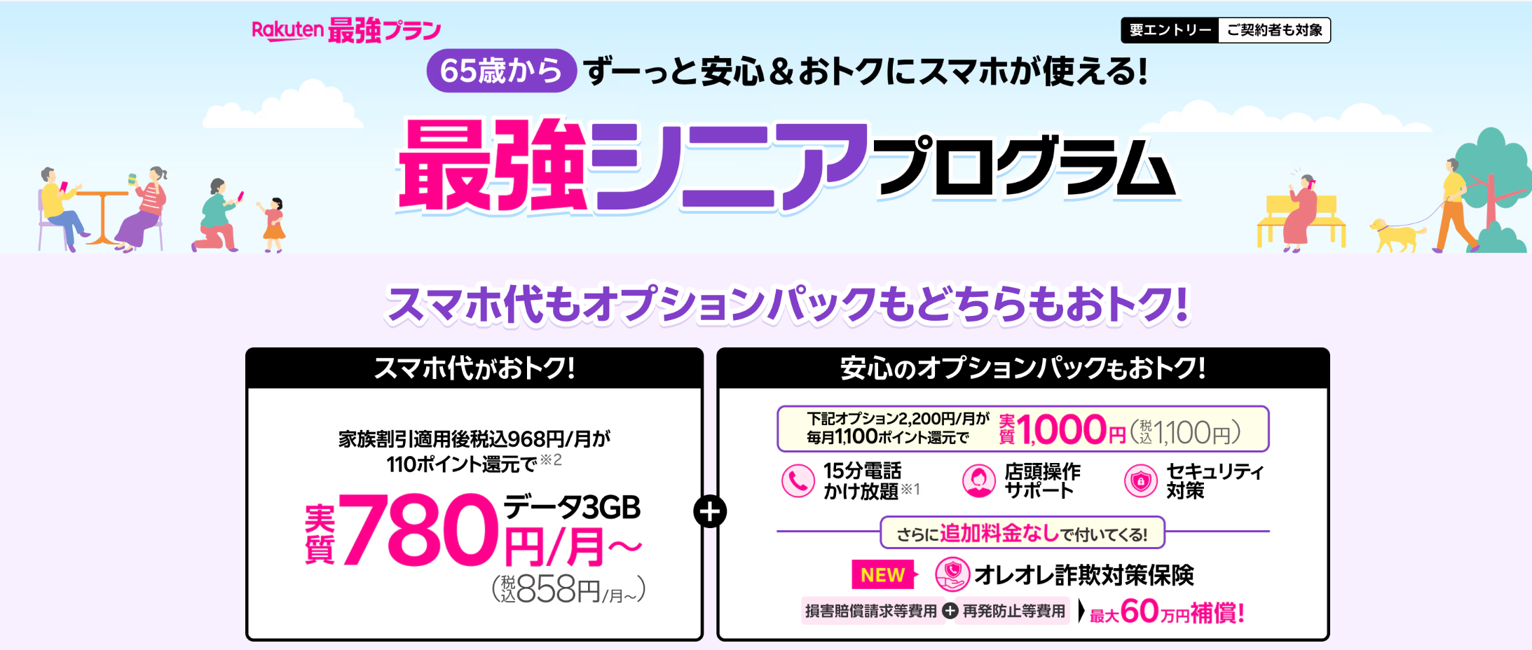 楽天モバイルの「最強シニアプログラム」なら、毎月110ポイント還元+通話かけ放題・安心パックが半額。