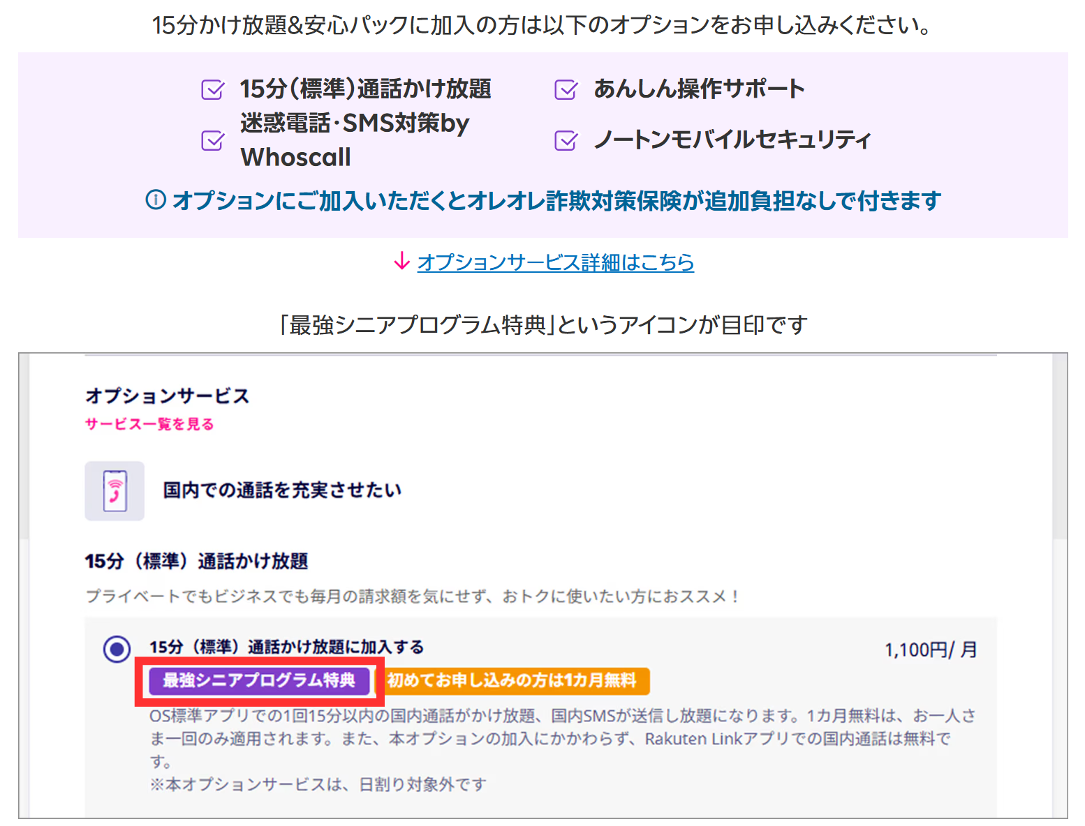 シニア向け4つのオプションがセットになった「15分かけ放題&安心パック」。