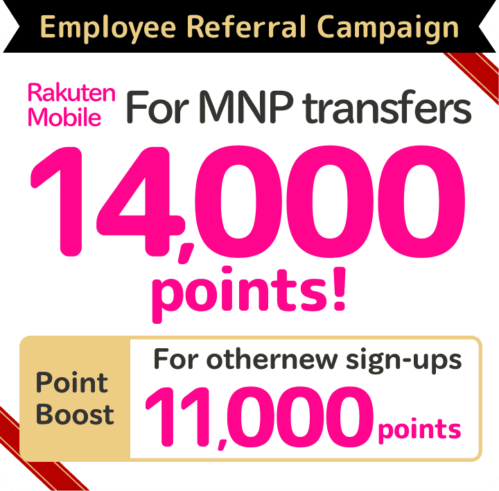 MNP transfer *For "Rakuten SAIKYO Plan" or "Rakuten SAIKYO U-NEXT" applications made by referred customers after 0:00 a.m. on Sunday, December 1, 2024, the points will be granted over a period of 3 months, starting 4 months after the month of the referral login. 14,000 Points *For referrals logged in by referred customers after 0:00 a.m. on Friday, November 1, 2024, the points will be granted over a period of 12 months, starting 4 months after the month of the referral login. 14,000 Points *For referrals logged in by referred customers by 23:59 on Thursday, October 31, 2024, the reward will be granted for three months starting from the fourth month after the month of the referral login. 14,000 Points If you use 6,000 yen discount coupon at the Rakuten Mobile's official Rakuten Ichiba shop, you will receive the following benefits. *For "Rakuten SAIKYO Plan" or "Rakuten SAIKYO U-NEXT" applications made by referred customers after 0:00 a.m. on Sunday, December 1, 2024, the points will be granted over a period of 3 months, starting 4 months after the month of the referral login. 8,000 Points *For referrals logged in by referred customers after 0:00 a.m. on Friday, November 1, 2024, the points will be granted over a period of 12 months, starting 4 months after the month of the referral login. 8,000 Points *For referrals logged in by referred customers after 23:59 on Thursday, October 31, 2024, the reward will be granted for three months starting from the fourth month after the month of the referral login. 8,000 Points New *For "Rakuten SAIKYO Plan" or "Rakuten SAIKYO U-NEXT" applications made by referred customers after 0:00 a.m. on Monday, September 1, 2025, the points will be granted over a period of 3 months, starting 4 months after the month of the referral login. 11,000 Points *For "Rakuten SAIKYO Plan" applications made by referred customers after 0:00 a.m. on Sunday, December 1, 2024, the points will be granted over a period of 3 months, starting 4 months after the month of the referral login. 7,000 Points *For referrals logged in by referred customers after 0:00 a.m. on Friday, November 1, 2024, the points will be granted over a period of 12 months, starting 4 months after the month of the referral login. 7,000 Points *For referrals logged in by referred customers by 23:59 on Thursday, October 31, 2024, the reward will be granted for three months starting from the fourth month after the month of the referral login. 7,000 Points |