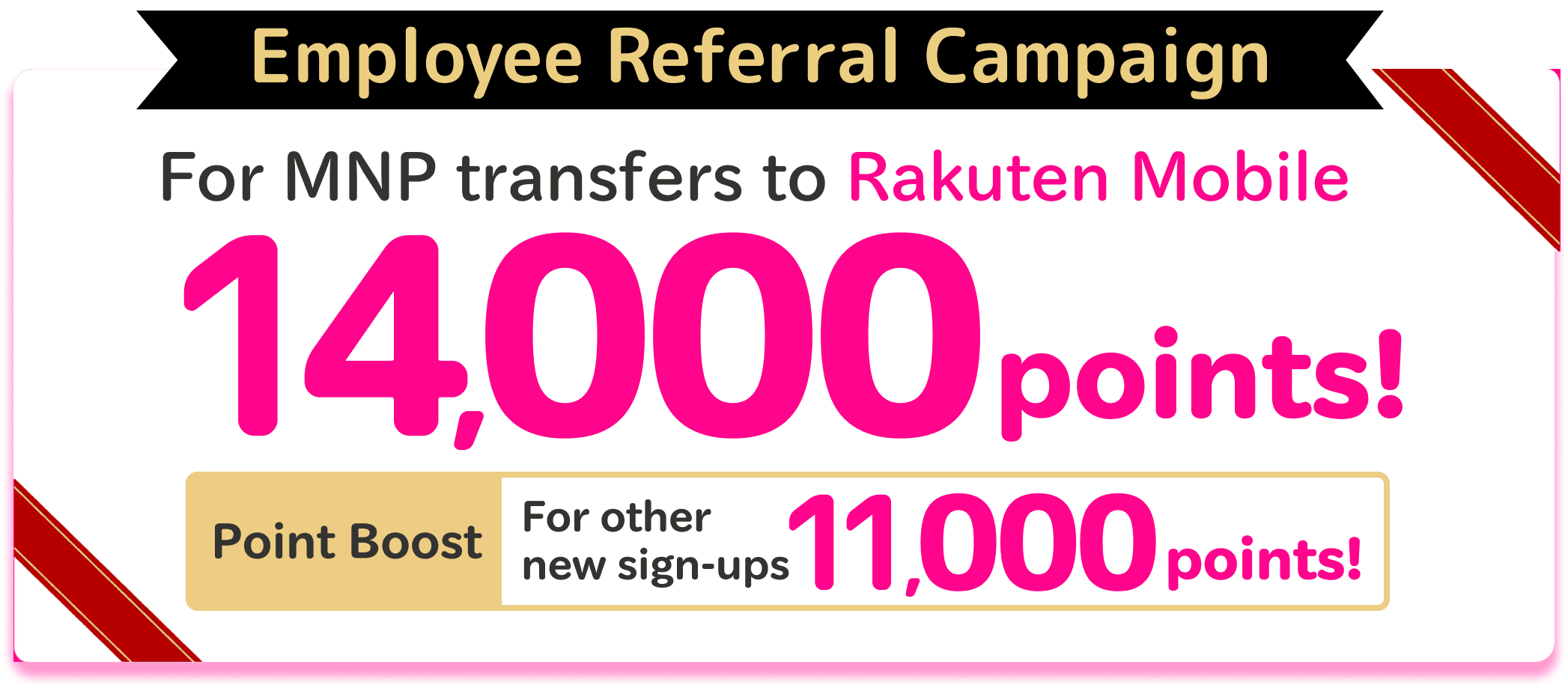 MNP transfer *For "Rakuten SAIKYO Plan" or "Rakuten SAIKYO U-NEXT" applications made by referred customers after 0:00 a.m. on Sunday, December 1, 2024, the points will be granted over a period of 3 months, starting 4 months after the month of the referral login. 14,000 Points *For referrals logged in by referred customers after 0:00 a.m. on Friday, November 1, 2024, the points will be granted over a period of 12 months, starting 4 months after the month of the referral login. 14,000 Points *For referrals logged in by referred customers by 23:59 on Thursday, October 31, 2024, the reward will be granted for three months starting from the fourth month after the month of the referral login. 14,000 Points If you use 6,000 yen discount coupon at the Rakuten Mobile's official Rakuten Ichiba shop, you will receive the following benefits. *For "Rakuten SAIKYO Plan" or "Rakuten SAIKYO U-NEXT" applications made by referred customers after 0:00 a.m. on Sunday, December 1, 2024, the points will be granted over a period of 3 months, starting 4 months after the month of the referral login. 8,000 Points *For referrals logged in by referred customers after 0:00 a.m. on Friday, November 1, 2024, the points will be granted over a period of 12 months, starting 4 months after the month of the referral login. 8,000 Points *For referrals logged in by referred customers after 23:59 on Thursday, October 31, 2024, the reward will be granted for three months starting from the fourth month after the month of the referral login. 8,000 Points New *For "Rakuten SAIKYO Plan" or "Rakuten SAIKYO U-NEXT" applications made by referred customers after 0:00 a.m. on Monday, September 1, 2025, the points will be granted over a period of 3 months, starting 4 months after the month of the referral login. 11,000 Points *For "Rakuten SAIKYO Plan" applications made by referred customers after 0:00 a.m. on Sunday, December 1, 2024, the points will be granted over a period of 3 months, starting 4 months after the month of the referral login. 7,000 Points *For referrals logged in by referred customers after 0:00 a.m. on Friday, November 1, 2024, the points will be granted over a period of 12 months, starting 4 months after the month of the referral login. 7,000 Points *For referrals logged in by referred customers by 23:59 on Thursday, October 31, 2024, the reward will be granted for three months starting from the fourth month after the month of the referral login. 7,000 Points |
